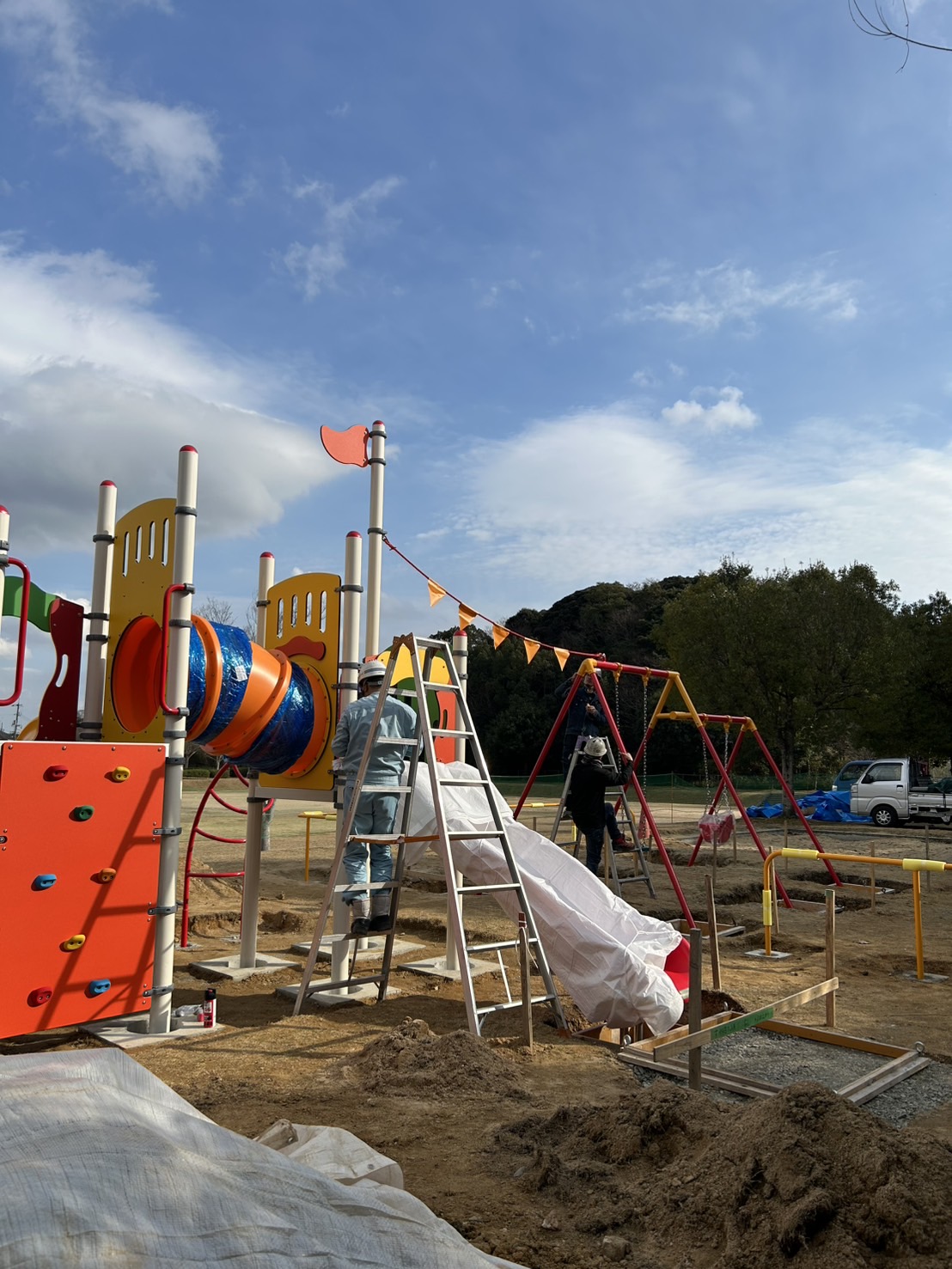 | 突然の寒空に見舞われたりもありましたが、小月公園の遊具は順調に進んでおります🛝もう少し、待ってね🌳… |